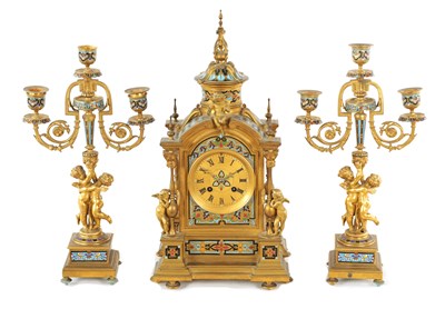 Lot 1032 - A FINE 19TH CENTURY FRENCH ORMOLU AND CLOISONNÉ ENAMEL THREE PIECE CLOCK GARNITURE