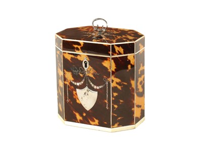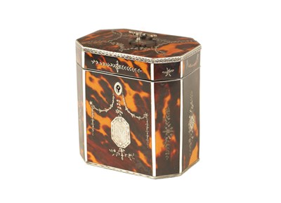 Lot 1153 - † A FINE GEORGE III TORTOISHELL, IVORY AND MOTHER OF PEARL INLAID FACETTED TEA CADDY