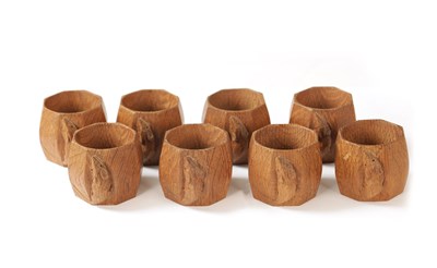 Lot 1099 - A GOOD SET OF EIGHT ROBERT 'MOUSEMAN' THOMPSON MEDIUM OAK SLIGHTLY ADZED SERVIETTE RINGS