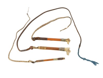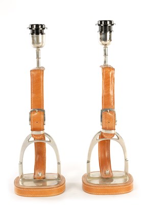 Lot 732 - A PAIR OF MODERN CHROME STEEL AND LEATHER STIRRUP TABLE LAMPS