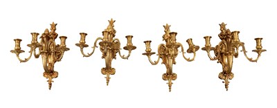 Lot 744 - A SET OF FOUR GOOD QUALITY ORMOLU HANGING WALL LIGHT CANDELABRA