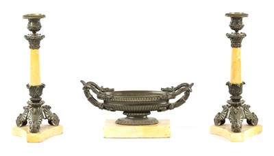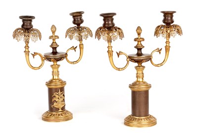 Lot 730 - A PAIR OF REGENCY FRENCH BRONZE AND GILT BRONZE TWO BRANCH CANDELABRA