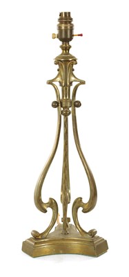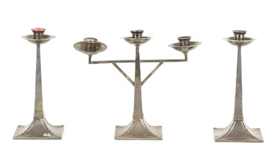 Lot 763 - A SET OF THREE ARTS AND CRAFTS CORNISH PEWTER CANDELABRA TABLE SET IN THE LIBERTY STYLE