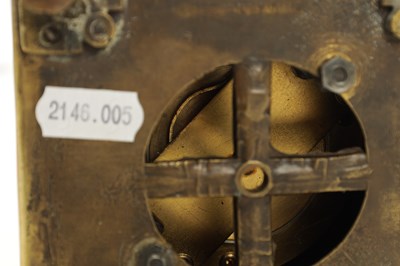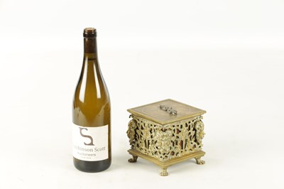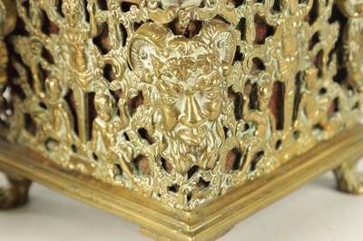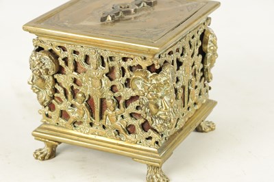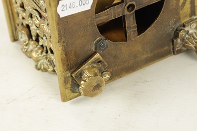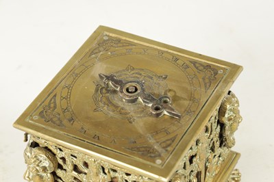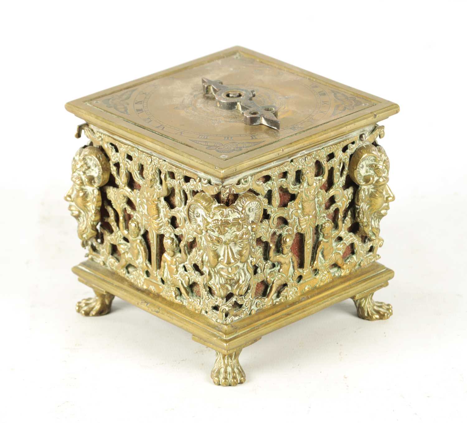 A LATE 19TH CENTURY AUGSBURG STYLE BRASS CASED TABLE CLOCK, the case with pierced relief decoration depicting cherubs and maiden, the corners with applied masks of Zeus, the square dial with Roman chapter ring surrounding a tulip centre fronting an eight day spring driven movement with platform balance escapement.