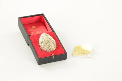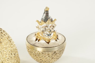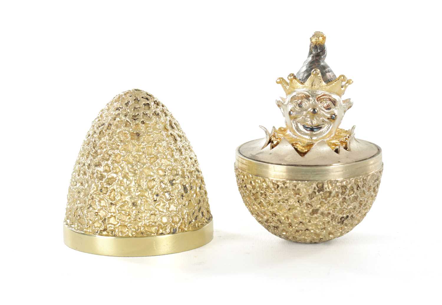 A 1972 STUART DEVLIN SILVER GILT NOVELTY EGG, the textured body with a plain girdle opening to reveal a sprung head of a clown - stamped on base no. 149 of a limited edition of 300 pieces, in original fitted box.