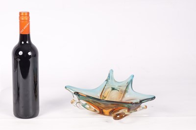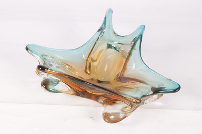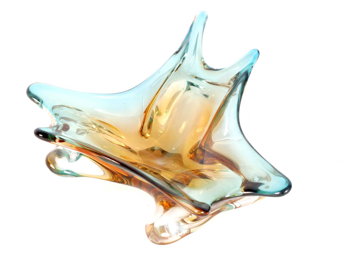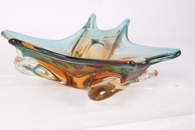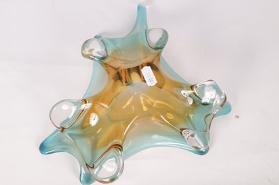 A 1960S AMBER AND PALE BLUE SHADED CLEAR SHALLOW GLASS DISH of random shaped and pointed form.