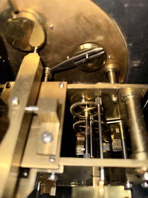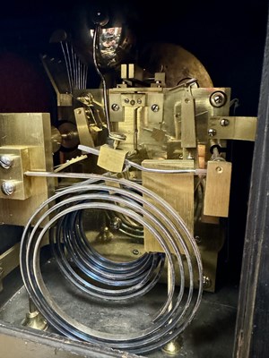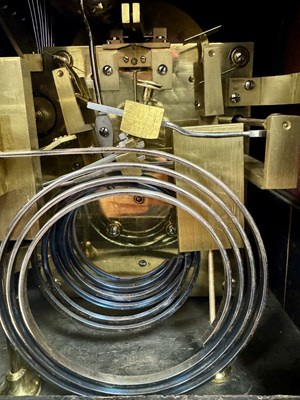A FINE AND IMPRESSIVE LATE 19TH CENTURY BRASS INLAID BOULLE WORK AND EBONSIED THREE TRAIN BRACKET CLOCK the case with galleried cushion moulded top above brass grilled side panels and outset columns to the front door enclosing an arched gilt scrolling foliated engraved dial with silvered Roman chapter ring and subsidiary dials above for chime/silent, Westminster/eight bell chime and regulation dial to the centre. The substantial three-train chain-driven fusee repeating movement with anchor escapement quarter striking on a series of eight bells/four gongs and hour striking on an optional large bell/gong.