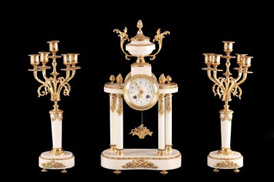A LATE 19TH CENTURY FRENCH WHITE MARBLE AND ORMOLU CLOCK GARNITURE