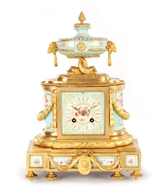 A 19TH CENTURY FRENCH ORMOLU AND SERVES STYLE PORCELAIN PANELLED MANTLE CLOCK