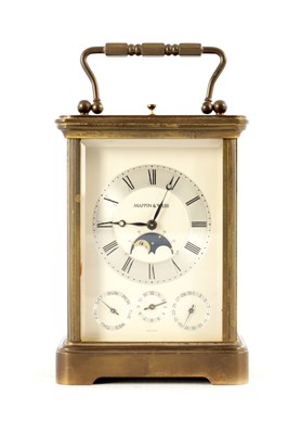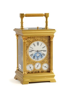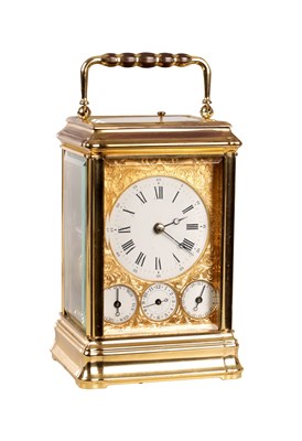 A 20TH CENTURY FRENCH GILT BRASS REPEATING CARRIAGE CLOCK WITH CALENDAR WORK AND ALARM