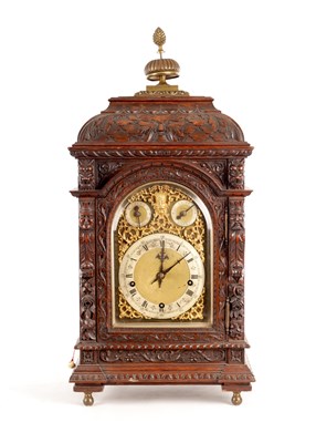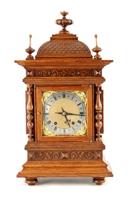 A LATE 19TH CENTURY GERMAN CARVED OAK QUARTER CHIMING BRACKET CLOCK