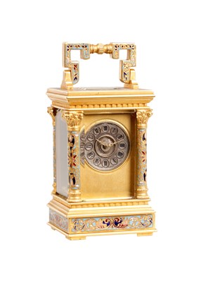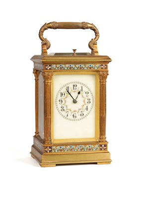 A GOOD LATE 19TH CENTURY GILT BRASS AND CHAMPLEVE ENAMEL CARRIAGE CLOCK OF SMALL SIZE