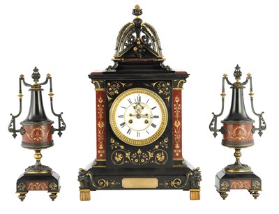A GOOD 19TH CENTURY BLACK SLATE AND ROUGE MARBLE CLOCK GARNITURE